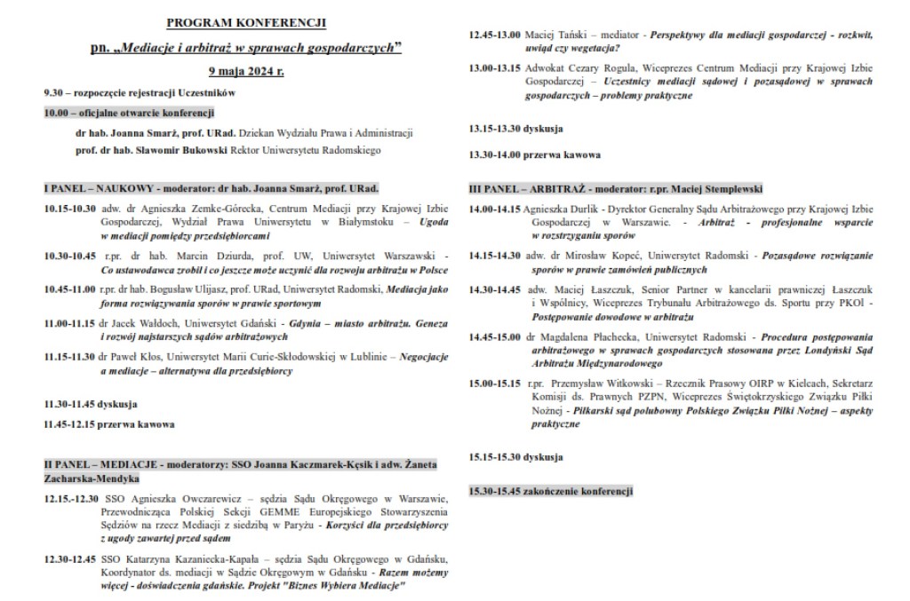 W konferencji będzie można uczestniczyć stacjonarnie lub zdalnie, a udział w niej jest bezpłatny. Wszyscy zainteresowani tematyką związaną z mediacjami i arbitrażem w sprawach gospodarczych, mogą rejestrować się do 30.04.2024 r.